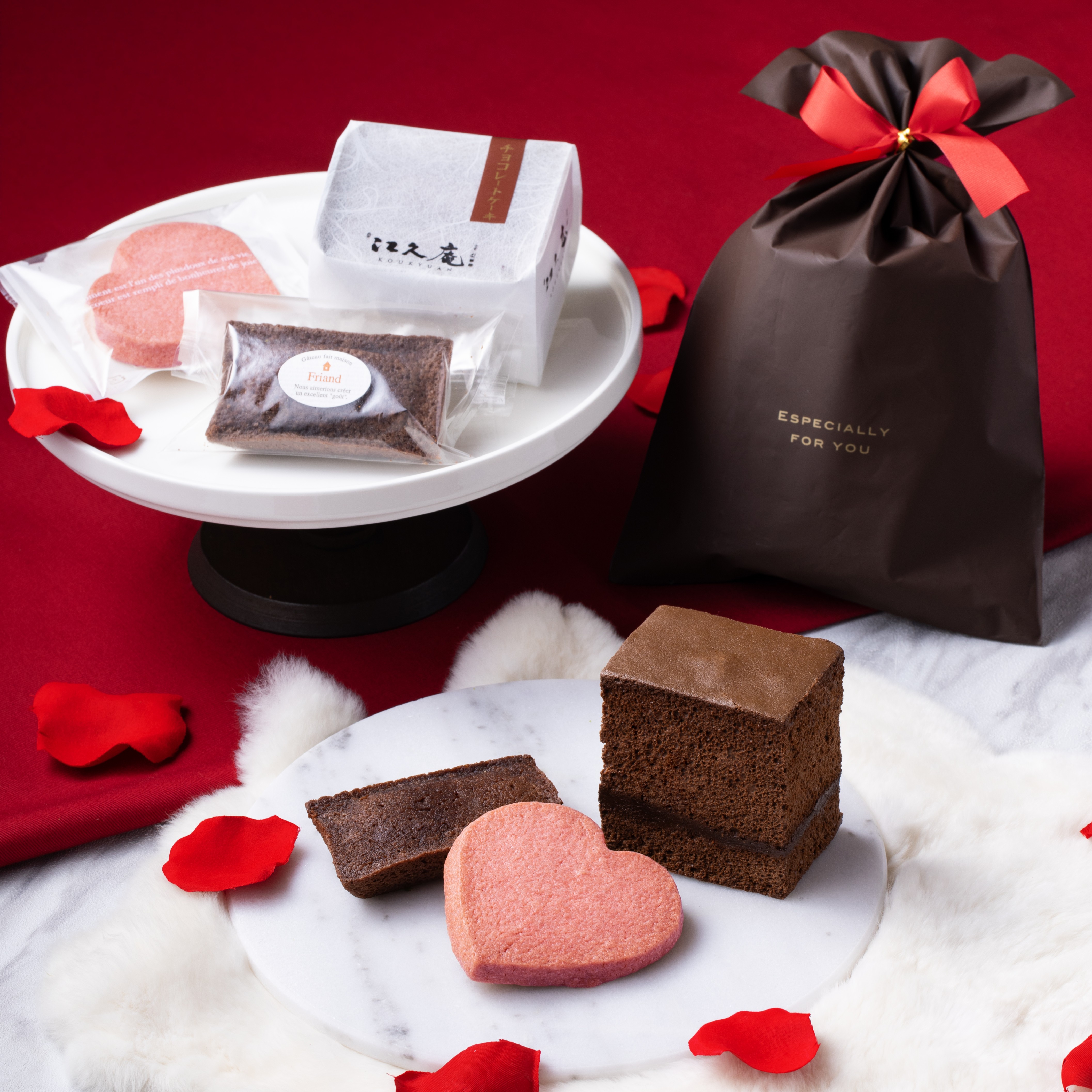 (江久庵バレンタインセット:チョコレートケーキCube 1個・ハートのクッキー1個・フリアンショコラ1個)